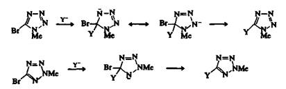 Рис. 1. Реакции нуклеофильного замещения 5-6ромо-1-метилтетразола и 5-бромо-2-метилтетразола.