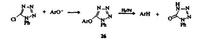 Катализируемая основаниями реакция 5-хлоро-1-фенилтетразола с фенолами приводит к образованию эфиров 26, которые могут затем подвергаться восстановительному расщеплению при взаимодействии с водородом над палладиевым катализатором, что служит хорошим методом дезоксигенировния фенолов.