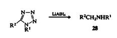 Азолы обычно с трудом подвергаются раскрытию цикла. Эти соединения устойчивы к окислительному расщеплению и не раскрываются под действием большинства восстановителей. При взаимодействии 1,5-дизамещенных тетразолов с алюмогидридом лития образуются амины 28.