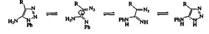 Цепные таутомеры обратимо циклизуются, но в зависимости от природы заместителей и условий реакции они могут перегруппировываться и подвергаться другим реакциям, в ходе которых происходит отщепление азота. При нагревании тетразолов и 1,2,3-триазолов, имеющих аминогруппу в положении 5, происходит перегруппировка Димрота. Эта реакция проиллюстрирована для 5-амино-1 -фенил-1,2,3-триазолов на рис. 3. Положение равновесия таких перегруппировок зависит от природы заместителей и от рН растворителя.