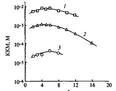 Рис. 4. Зависимость KKM от числа метиленовых групп в мостике для трех типов катионных димерных ПАВ: 1 — Ci0H2IN2-5-N2C1OH2I2Br-; 2 — Ci2H25N2-5-N2Ci2H2S2+ 2ВГ; 3 — Ci6H33N-5- N2Ci6H332* 2ВГ