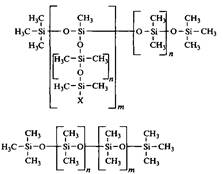 Рис. 9. Примеры силиконовых поверхностно-активных веществ. X — это обычно ионная или неионная полярная группа, чаще всего сополимер ЭО-ПО; иногда X — слабополярная группа, например сложноэфирная, амидная, эпоксидная и др.