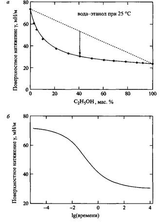 Рис. 4. а — Поверхностное натяжение изменяется от среднеарифметического значения для индивидуальных компонентов до равновесного поверхностного натяжения. С разрешения John Wiley& Sons, Inc б — После образования новой поверхности система релаксирует до равновесного поверхностного натяжения вследствие адсорбции более поверхностно-активных молекул