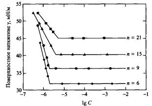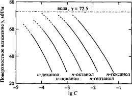Адсорбцию поверхностно-активного компонента можно определить по наклону зависимости поверхностного натяжения от логарифма концентрации. На рис. 5 представлены такие зависимости для ряда растворов в воде спиртов с неполярными радикалами средней длины. Зависимости имеют одинаковый наклон. Это указывает на то, что адсорбция не зависит от длины углеводородного радикала. Следует отметить практически линейный характер этих зависимостей при высоких концентрациях, что указывает на постоянство адсорбции). Для мономолекулярной адсорбции количество адсорбированного вещества обратно пропорционально площади поперечного сечения адсорбированной молекулы А. Соотношение имеет вид