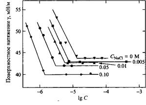 Как и спирты с гидрофобными группами средней длины, поверхностно-активные вещества также адсорбируются на поверхности жидкость-воздух так, что полярные группы направлены в сторону воды, а гидрофобные части молекул — в сторону воздуха. На рис. 6 показаны изотермы поверхностного натяжения этоксилированного алкилсульфата при различных концентрациях соли. Видно, что с увеличением содержания соли а) снижается ККМ, б) предельное поверхностное натяжение при концентрациях выше KKM уменьшается, в) наклон кривых вблизи KKM увеличивается, что указывает на увеличение адсорбции в соответствии с уравнениями. Все три факта указывают на увеличение критического параметра упаковки системы вследствие экранирования противо-ионами полярных групп поверхностно-активного вещества. Из наклона кривых ниже KKM можно определить, что при повышении концентрации соли молекулы ПАВ упаковываются в поверхностном слое плотнее в соответствии с увеличением эффекта экранирования электролитом.