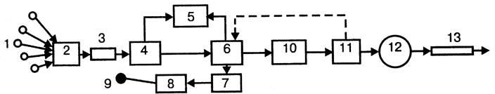 1 — скважины; 2 — групповая замерная установка; 3 — коллектор; 4 — дожимная насосная станция; 5 — газоперерабатывающий завод; 6 — установка подготовки нефти; 7 — установка очистки воды; 8 — насосы; 9 — нагнетательные скважины; 10 — герметизированные резервуары, 11 — установка «Рубин»; 12 — товарные резервуары; 13 — магистральный нефтепровод.