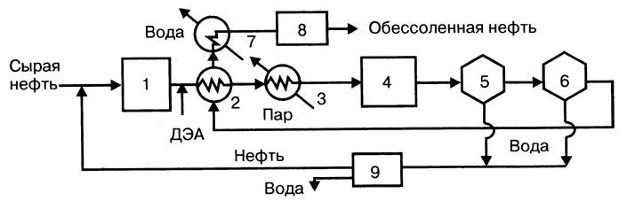 1 — резервуар нефти; 2 — теплообменник; 3 — подогреватель; 4 — смеситель; 5 — электродегидрататор I ступени; 6 — электродегидрататор II ступени; 7 — холодильник; 8 — сборник обессоленной нефти; 9 — нефтеотделитель.