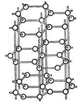 Две основные разновидности углерода - графит и алмаз - существенно отличаются по свойствам. Мягкий графит имеет слоистое строение (рис. 2).Все атомы углерода находятся здесь в состоянии sp2-гибридизации: каждый из них образует три ковалентные связи с соседними атомами, причем углы между направлениями связи равны 120°. Графит электропроводен и хорошо раскалывается по плоскости. В обычных условиях графит и является наиболее устойчивой модификацией. Переход графита в алмаз возможен при очень высоких давлениях (порядка 125000 атм) и температурах (около 3000 °С). Однако исследование этого процесса сначала с теоретических позиций, а затем экспериментальным путем показало, что в присутствии катализаторов (железо, платина) графит превращается в алмаз уже при давлении 60000—80000 атм и температуре 1400—1600 °С. В настоящее время налажено производство искусственных алмазов для технических целей, причем размеры их обычно колеблются от 0,5 до 4 мм; в отдельных случаях удается получить и большие экземпляры. Структура алмаза (рис. 1) типично тетраэдрическая; атомы углерода прочно соединены за счет перекрытия sp3-орбиталей. Хотя в обычных условиях алмаз нестабилен, но практически он может сохраняться неопределенно долгое время. При сильном накаливании алмаза происходит его постепенная графитизация.