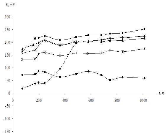Рисунок 5.2 – Изменение значений коррозионного потенциала системы окрашенный металл – электролит.