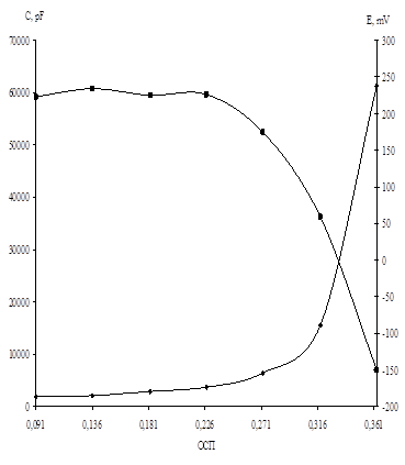 На рисунке 5.3 представлена зависимость коррозионного потенциала и электрохимической емкости системы сталь – покрытие – электролит от содержания соосажденного манганат(IV)силиката кальция. Время контакта электролита с покрытием 1000 часов.
