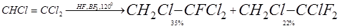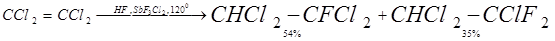 При присоединении фтористого водорода очень часто происходит частичное замещение галогена фтором. Подобный обмен можно облегчить, если в реакционную смесь ввести дихлортрифторид сурьмы: