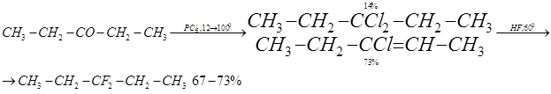 Образование гвминальных дифторпроизводных возможно при присоединении фтористого водорода к ацетиленам или при присоединении фтористого водорода к галогенолефинам с галогеном при двойной связи, причем может произойти частичное или даже полное замещение галогена фтором. Те же продукты образуются при реакции фтористого водорода или фторидов сурьмы с геминальными дигалогенпарафинами, которые легко могут быть получены из кетонов. Реакцию хорошо иллюстрирует получение 3,3-дифторпентана из диэтилкетона: