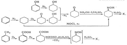 pкрит 47,62.105 Па; температурный коэффициент объемного расширения 0,00104 К-1 (80 90 °С); С0p при 60 и 70 °С соотв. 1,67 и 1,76 кДж/(кг.К); DH0обр -269,63 кДж/моль, DH0сгор - 3605,2 кДж/моль; S0298 1,49 Дж/(моль.К). Уравнения температурной зависимости давления пара: для твердого (308-333 К) lgp (мм рт. ст.) = 13,06 + 4,73.10-3/T, жидкого (353-413К) lgp (мм рт.ст.) = 6,78 + 2344/T; h 0,009 и 0,0047 Па.с соответственно при 78 и 100 °С; g 33,4.10-3 Н/м (130°С); теплопроводность 0,2326 Вт/(м.К); e 74 (20 °С, 20%-ный водный р-р). Капролактам хорошо растворим в воде, органических растворителях и в разбавленной H2SO4; теплота растворения в воде 35,17 Дж/кг, в концентрированной H2SO4 611,27 Дж/кг (298-305 К). По химическим свойствам Капролактам - типичный представитель лактамов. При нагревании с концентрированными минеральными кислотами образует соли; в присутствии небольших количеств воды, спиртов, аминов, карбоновых кислот при 250-260 °С полимеризуется с образованием полиамидной смолы, из которой затем получают волокно капрон (Поли-e-капроамид). В промышленности Капролактам получают из бензола, фенола или толуола по схемам: