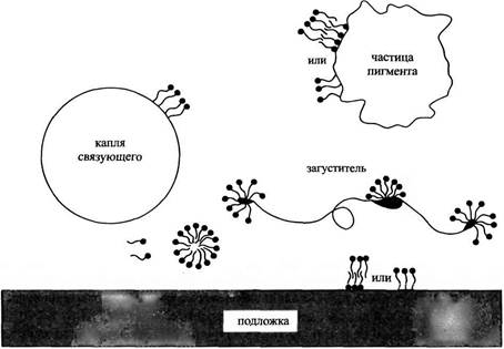 Конкурентная адсорбция является источником серьезных проблем в композициях красок и в ряде других композиционных продуктов. Пигментированные латексные покрытия содержат разнообразные границы раздела фаз. Поверхностно-активные вещества будут стремиться адсорбироваться на каждой из поверхностей. Кроме того, ПАВ могут образовывать мицеллы или агрегироваться с гидрофобными сегментами молекул загустителей, которые обычно добавляются в настоящее время в латексные краски. Обычно различные ПАВ вводятся в систему одновременно с индивидуальными компонентами, например эмульгаторы с вяжущими, диспергаторы с пигментами, смачиватели также добавляются непосредственно в композиции. Система становится очень сложной, и протекающие в ней процессы конкурентной адсорбции создают проблемы во всех пигментных эмульсионных красках. ПАВ, вводимое в качестве эмульгатора для связующего, может десорбироваться с поверхности капель эмульсии и адсорбироваться на частицах пигмента, а диспергатор пигмента может также оказаться на других границах раздела фаз. Эти обменные явления служат причиной нестабильности систем и нежелательных реологических свойств. Решение проблемы в значительной мере заключается в использовании полимеризующихся поверхностно-активных веществ.
