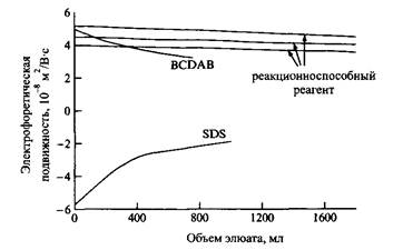 Рис. 7. Зависимость электрофоретической подвижности полистирольных латексов от разбавления. Латексы получены с использованием полимеризующихся катионных ПАВ, показанных на рис. 6. Для сравнения приведены те же зависимости для латексов, полученных с использованием не способных к полимеризации ПАВ: бромида бензилцетилдиметиламмония, а также додецилсульфата натрия
