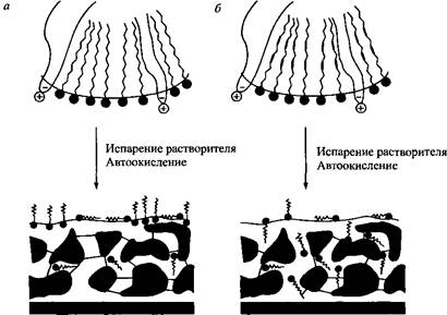 Поверхность пленок красок и лаков также можно модифицировать за счет миграции растворенных ПАВ к поверхности пленка - воздух в процессах сушки и отверждения. Этот принцип иллюстрирует рис. 9 для ПАВ, полимеризующихся при УФ-облучении.