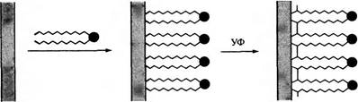Рис. 9. Модифицирование поверхности твердого тела с использованием ПАВ, полимеризующихся при облучении ультрафиолетом