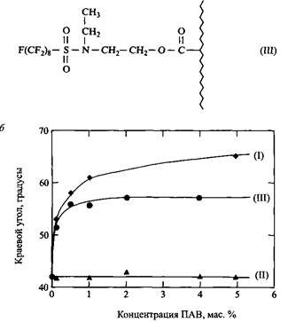 Поверхностный слой фторуглерода можно получить при растворении в лаках небольшого количества способного к полимеризации фторированного ПАВ и образовании поперечно-сшитого монослоя ПАВ на поверхности пленки. На рис. 10, а показаны два фторированных ПАВ, которые были использованы в экспериментах; ПАВ способно к полимеризации, а ПАВ — нет.