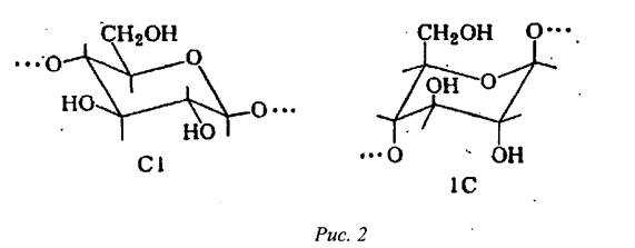 Необходимо отметить, что при одном и том же строении элементарногозвена в зависимости от конформации пиранозного цикла меняется пространственная ориентация заместителей (ОН-групп) в цикле. Гидроксильные группы в элементарном звене могут быть расположены экваториально, т. е. в плоскости кольца, или аксиально - перпендикулярно к этой плоскости: