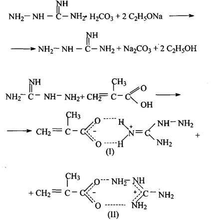 В спиртовой раствор аминогуанидина, предварительно полученный из этилата натрия и гидрокарбоната аминогуанидина, при охлаждении до - 10 °С добавили эквимольное количество метакриловой кислоты (температура в реакционной массе при этом не превышала -5 °С). Раствор перемешивали 3 часа при комнатной температуре, после чего МКАГ выделяли из спиртового раствора высаждением их в избыток диэтилового эфира. Полученную соль перекристаллизовывали из смеси воды и этанола. Выход «73 %.