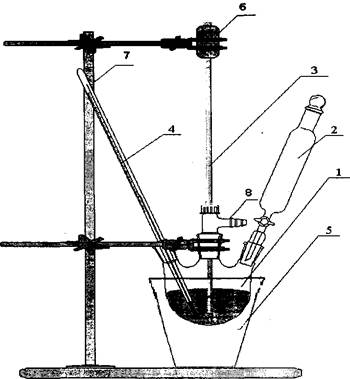 1 - трехгорлая круглодонная колба; 2 - капельная воронка; 3 - мешалка; 4 - термометр; 5 - баня с охлаждающей смесью; 6 - электромотор; 7 - штатив с лапками; 8 - газоотводная трубка.