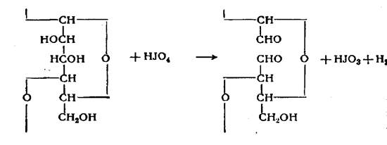 При действии йодной кислоты на многоатомные спирты, в частности на моно- и полисахариды, происходит одновременное окисление в альдегидные группы двух соседних спиртовых групп (гликолевая группировка) с одновременным разрывом углерод-углеродной связи между ними. Для целлюлозы процесс окисления протекает с разрывом пиранового кольца по следующей схеме: