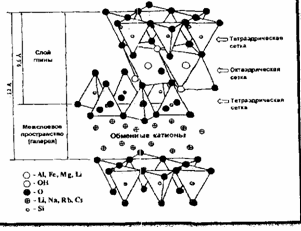 Монтмориллонит (Na,K,Ca)(A],Fe,Mg)[(Si,AI)4Oio](OH)2-nH2О (именуется по названию местности Монтморилльон во Франции) - это высокодисперсный слоистый алюмосиликат белого или серого цвета, в котором за счет нестехиометрических замещений катионов кристаллической решетки, появляется избыточный отрицательный заряд, который компенсируется обменными катионами, расположенные в межслоевом пространстве. Главной особенностью монтмориллонита является его способность к адсорбции различных ионов (в основном катионов), а также к ионному обмену. С водой образует пластичные массы, при этом, разбухая, может увеличиваться в объеме в 10 раз. Входит в состав бентонитовых глин (слово "бентонит" - происходит от названия местности Бентон в США).