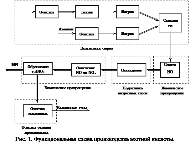 Сырьем служит недорогой и легко доступный синтетический аммиак, который при оптимально подобранных параметрах практически весь идет на получение монооксида азота; реакция протекает необратимо и быстро и не требует рециклов. Применение повышенного давления способствует уменьшению размеров аппаратов и увеличению производительности, но при этом увеличивается температура и количество сеток катализатора. Для обеспечения выхода оксида азота более 98% при давлениях 0,41 – 0,71 МПа необходима температура выше 950 ºС, зато время контактирования становится менее 1,1×10-4 с, а скорость газа более 160 л/мин. Вообще, повышение температуры способствует увеличению выхода, но это приводит к большим прямым потерям дорогостоящего катализатора.