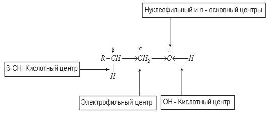 В молекуле спиртов можно выделить следующие реакционные центры, показанные ниже на рис. 2 [4, 12, 13, 33]: