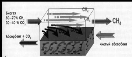 Способ мембранного разделения СН4 и СО2 основан на различной проницаемости компонентов газа через мембрану. Ученые из Института нефтехимического синтеза (ИНХС) РАН предложили сочетать этот способ с абсорбционным методом разделения (рис. 4) Такие установки обеспечивают производительность 50 м3/ ч.