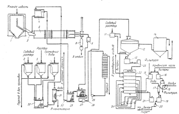 1 – силос для извести; 2,11 – сборники содового раствора; 3 – лотковый питатель; 4 – напорный сборник содового раствора; 5 – сборник раствора, полученного при растворении солей выпарки; 6 – гаситель–каустификатор; 7 – сборник промывных вод; 8 – бункер недопада; 9 – сифонное корыто; 10, 13 – каустификаторы первой и второй каустификации; 12 – отстойник; 14 – сборник слабых щелоков; 15 – барабанный вакуум-фильтр; 16 – напорный бак конденсата; 17 – шнековая мешалка; 18 – сборник конденсата и фильтрата; 19 – мешалка шлама; 20, 23–26, 30, 32 – насосы; 21, 28 – приемные мешалки шлама и суспензии; 22 – шестиярусный промыватель шлама; 27 – пескоулавитель; 29 – мешалка перелива; 31 – трубчатый подогреватель; 33 – смеситель для получения нормального содового раствора.