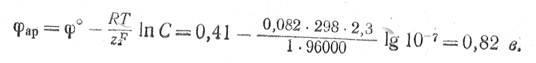 Нормальный электродный потенциал разряда ОН--ионов составляет + 0,41 в, а нормальный электродный потенциал разряда ионов хлора равен + 1,36 в. В нейтральном насыщенном растворе хлористого натрия концентрация гидроксильных ионов около 1 ·10-7 г-экв/л. При 25° С равновесный потенциал разряда гидроксильных ионов будет