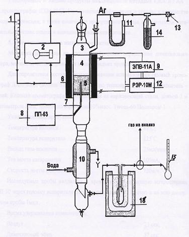 Перед началом экспериментов в кварцевый реактор (3), помещенный в каталитическую печь (6), через вентиль тонкой регулировки (13), моностат (14) и реометр (11) подавался аргон, расход которого, необходимый для нахождения количества газа, образовавшегося за время опыта, определяли по пенному расходомеру (15). Разогрев катализатора до 150-180°С проводили в токе аргона, дальнейший нагрев до реакционной температуры осуществляли в токе испаренного сырья.