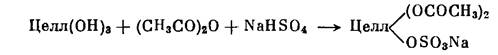 В работе [41] описан способ получения такого смешанного эфира путем обработки целлюлозы при 273-288 К смесью, содержащей безводную H2SO4, алифатическую кислоту и ангидрид последней. Например, в случае использования уксусной кислоты и её ангидрида получался порошкообразный продукт, содержащий 7,1 % S, 7,7 % СН3СО-групп и полностью растворимый в воде.