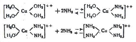 В первом случае устанавливается равновесие между купригидроксо- и куприамминовым ионами; причем в зависимости от того, какое количество аммиака содержится в водном растворе, в комплексном ионе замещаются на аммиак две или четыре частицы воды: