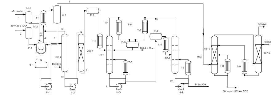 М – мерник; Е – емкость; Р – реактор; С – сепаратор; Т – теплообменник; СР – скруббер; БК – барбатажная колонна; АД – адсорбер; РК – ректификационная колонна.
