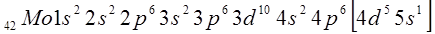 Покажем расположение валентных электронов в атоме молибдена. Как видно из электронной формулы молибден относится к d-элементам, поскольку у него заполняется 4d-подуровень.