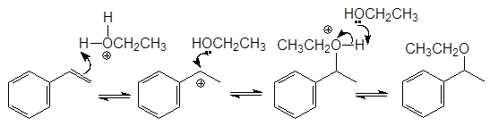 Суммарный результат соответствует присоединению спирта по двойной связи алкена в соответствии с правилом Марковникова.