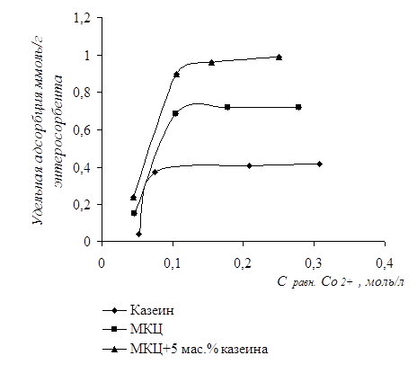 Анализируя кривые адсорбции относительно ионов Со2+ (рис.3) на поверхность сорбента из раствора можно сделать вывод, что процент связывания ионов кобальта с сорбентом на основе МКЦ и казеина выше, чем отдельных компонентов сорбента. Данное обстоятельство можно объяснить не только процессами, связанными с наличием активных групп, входящих в состав казеинового комплекса, но и самой структурой сорбционной матрицы. Кроме того, ионы кобальта оказывают незначительное влияние на мицеллу казеина, тем самым, не нарушая имеющих место межмолекулярных взаимодействий. При этом адсорбционные процессы протекают по классической схеме локализованной адсорбции (кривая адсорбции казеина относительно ионов Со2+ рис. 3) .