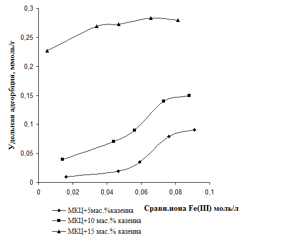 Анализируя кривые адсорбции относительно ионов Fe (рис.4) на поверхность сорбента из раствора можно сделать вывод, что процент связывания ионов железа с сорбентом на основе МКЦ и казеина выше, чем отдельных компонентов сорбента. Это обстоятельство объясняется структурой сорбционной матрицы. Кроме того, ионы железа оказывают незначительное влияние на мицеллу казеина, не нарушая межмолекулярных взаимодействий.