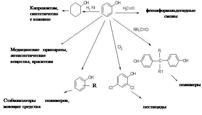 Наибольшие количества фенола используются для получения фенолформальдегидных смол, которые применяются в производстве фенопластов. Большие количества фенола перерабатывают в циклогексанол, который необходим для промышленности синтетического волокна. Смесь крезолов используют для получения крезолформальдегидных смол. Чистые крезолы применяют для синтеза красителей, медицинских препаратов, антисептических веществ, антиоксидантов. Схема применения фенола:
