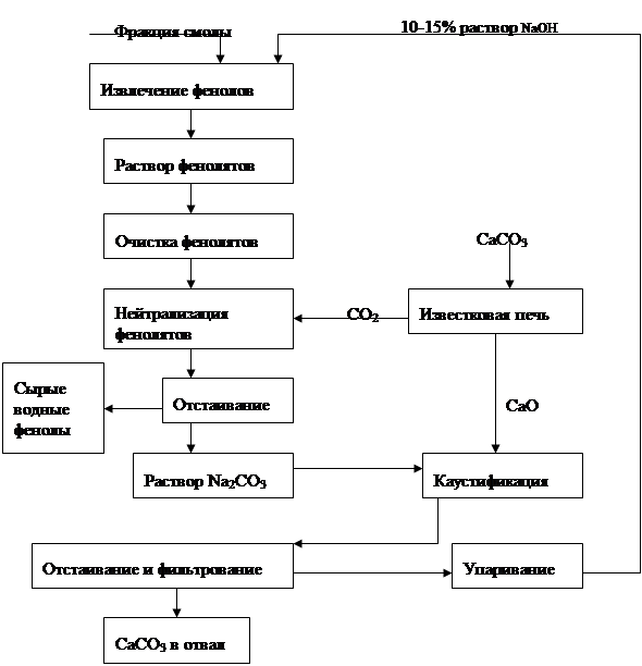 Для извлечения фенолов из фракций применяют экстракцию полярными растворителями, чаще всего метанолом и его водными растворами (рис. 1.1), а также экстракцию щелочью с переводом фенолов в феноляты. Последний способ обеспечивает наиболее полное и селективное извлечение фенолов, но связан с необратимым расходованием больших количеств достаточно дорогой щелочи. Используемая в промышленности каустификация содовых растворов, получаемых после разложения фенолятов, влечет за собой значительные расходы и образование больших объемов сточных вод (рис. 1.2).