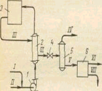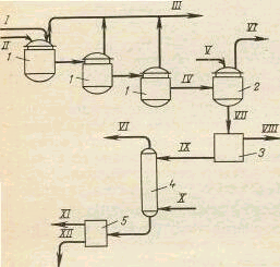 Потоки: I - арилсульфонат натрия, II — едкий натp; III - водяной паp; IV - продукты щелочного плавления; V - вода; VI - отбросные газы и пары; VII - paствop фенолятов в смеси с кристаллами сульфита натрия; IX - раствор фенолятов натрия; Х — двуокись серы; XI - фенолы; XII - сульфитный щелок.