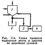 Щелочной шлам загружают в реактор 1. Жидкость подают через отверстие в нижней части реактора, она поднимается вверх и, проходя через шлам, образует суспензию, содержащую металлическую ртуть, раствор щелочи и твердые частицы. После разделения металлическая ртуть выводится из реактора и поступает в резервуар 2. Щелочной раствор выводится через отверстие в верхней части реактора /. Остаточный шлам подают в сепаратор 3, где происходит отделение остаточного щелочного раствора, который возвращается в реактор /. Твердая фаза из сепаратора 3 подается в муфель 4 для выделения остаточной ртути.