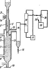Трубопровод 8 соединен с нижней частью конденсатора 10, в котором расположены жиклеры 11. Жидкость из нижней части конденсатора 10 подается насосом 12 через теплообменник 13 в жиклеры 11. В нижней части конденсатора 10 находится вентиль 15 для слива конденсирующейся металлической ртути. Ниже места входа трубы 9 расположена S-образная отводная трубка, соединенная с резервуаром для нейтрализации 16. В верхней части конденсатора 10 находится труба для отходящих газов 17.