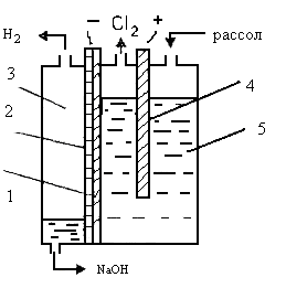 1 – перфорированный катод, 2 – диафрагма, 3 – катодное пространство, 4 – анод, 5 – анодное пространство.