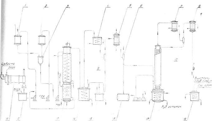 Винилацетат-сырец из напорного бака поступает в ректификационную колонну 2. При температуре верха колонны 21°С отгоняются в основном легколетучие продукты; после конденсации в дефлегматоре 3 часть конденсата направляется в колонну в виде флегмы, часть ого охлаждается в холодильнике 4 и собирается в сборнике 20.