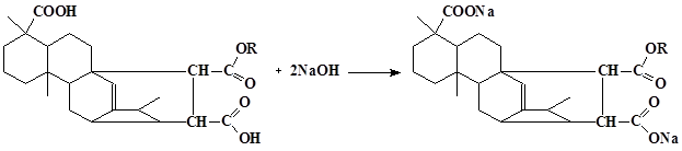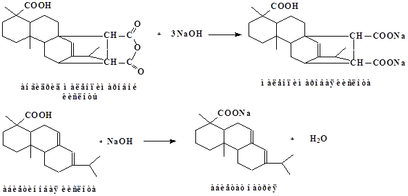 В результате нейтрализации образуется натриевые соли малеопимаровой кислоты и смоляных кислот. При этом нейтрализация малеопимаровой кислоты, как наиболее сильной, происходит в полном объеме. В свою очередь, часть модифицированных смоляных кислот после нейтрализации остается в составе клея в свободном неомыляемом виде /16/.
