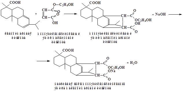 В американском патенте рекомендуется модифицировать канифоль итаковой и цитроконовой кислотами или их ангидридами в количестве 1-10 мас.ч. на 100 мас.ч. канифоли /14/. Смесь из канифоли и одной из указанных кислот или ее ангидрида нагревают до 140˚С. После этого продукт реакции подвергают перегонке при 190-260˚С и давлении 150-200 мм.рт.ст. для удаления канифольных масел. Последние усиливают пенообразование и флотацию волокна. На завершающей стадии получения пастообразного клея смоляные кислоты нейтрализуют едким натром на 70-80%.