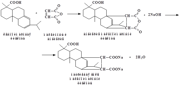 В основе процесса получения клея укрепленного лежит реакция модификации смоляных кислот живицы (терпентина) малеиновым ангидридом с последующей нейтрализацией полученного продукта едким натром.